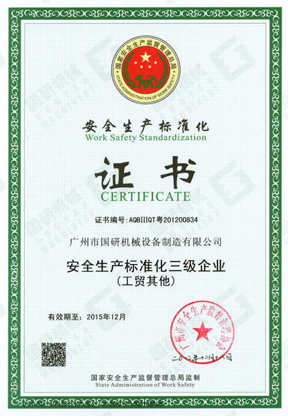 2012年12月24日,國家安全生產(chǎn)監(jiān)督管理總局為國研機(jī)械公司頒發(fā)了《安全生產(chǎn)標(biāo)準(zhǔn)化企業(yè)證書》,這意味著我司已達(dá)到《廣州市工業(yè)企業(yè)安全生產(chǎn)標(biāo)準(zhǔn)化評定辦法》及《廣州市工業(yè)企業(yè)安全生產(chǎn)標(biāo)準(zhǔn)化評定標(biāo)準(zhǔn)》的要求。