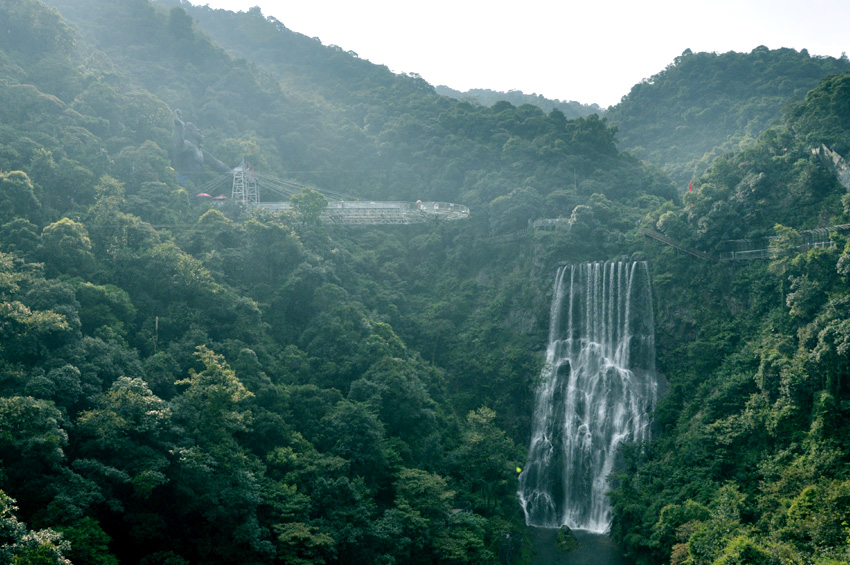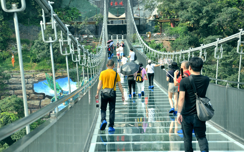 兩小時的小北江之游,大家都還余味未盡。導游又帶上大家趕往這次團建活動的重頭戲的目的地:古龍峽的“云天波霸”。今天公司參加團建的所有員工都要挑戰目前世界上較寬的高空玻璃橋,玻璃橋像一條通體透明的巨龍連接著峽谷兩岸,橋下懸空超過100米,站在橋上向下看,真是令人心驚膽戰,大家相互鼓勵,三三兩兩牽手前行,用相互的關愛順利通過并成功抵達世界大直徑的懸空玻璃平臺。盡管大家都汗流浹背,但每個人臉上都洋溢著喜悅。因為此時大家都收獲了克服恐懼心理后戰勝困難的勇氣和成功!